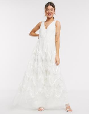 With Love plunge front prom maxi dress with feather effect skirt in white