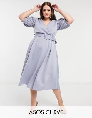 ASOS DESIGN Curve exclusive ruched shoulder belted soft prom midi dress in blue