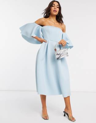 Midi dress by ASOS DESIGN Dramatic entrance, sorted Bardot neck Off-shoulder design Boned bodice Volume sleeves Fit-and-flare shape Zip-back fastening Regular fit True to size