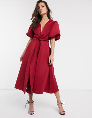bubble sleeve twist detail midi prom dress in deep red