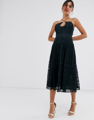 Midi dress by ASOS DESIGN Cue the party playlist Partially lined Crochet-lace trims Crossed cami straps Zip-back fastening Regular fit Just select your usual size