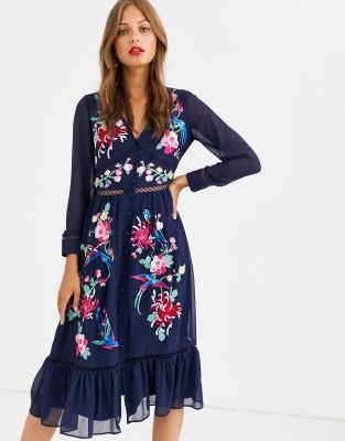 Midi dress by ASOS DESIGN Add-to-bag potential: considerable V-neck Floral embroidery Button placket Ladder stitching Pep-hem Regular fit Just select your usual size