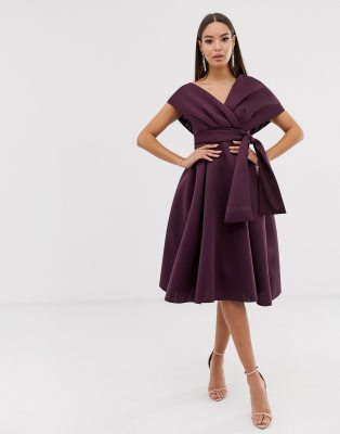 fallen shoulder midi prom dress with tie detail in aubergine