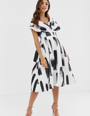 fallen shoulder midi prom dress with tie detail in brush stroke print