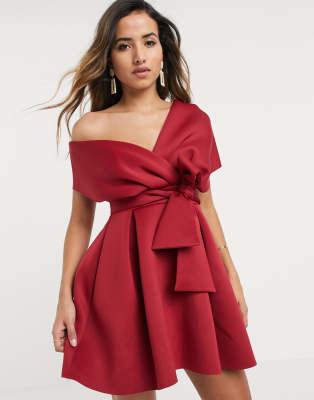 Mini dress by ASOS DESIGN For that thing you have to go to Off-the-shoulder design Tie waist Zip-back fastening Regular fit True to size
