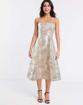 Midi dress by ASOS DESIGN Do get caught wearing it twice Floral pattern Bandeau neck Inner gripper tape for a secure fit Sleeveless style Zip-back fastening Regular fit True to size