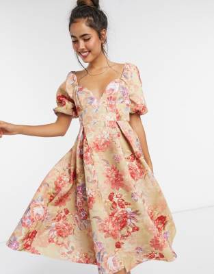 Midi dress by ASOS DESIGN Crack the dress code Floral design Plunge neck Stitched cups Puff sleeves Elasticated cuffs Pleated details Zip-back fastening Regular fit True to size
