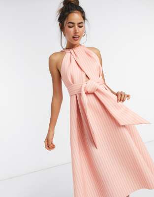 high neck belted prom midi dress in stripe