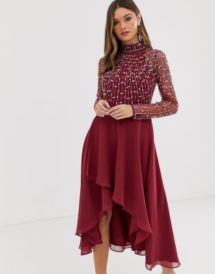midi dress with linear embellished bodice and wrap skirt
