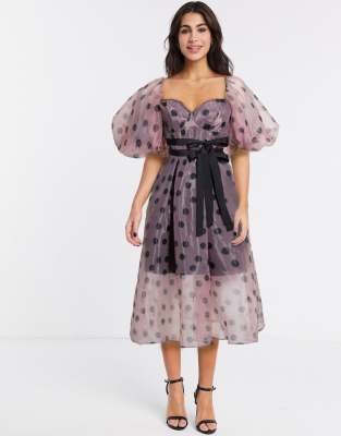 Midi dress by ASOS DESIGN If in doubt, go all out Polka-dot print Sweetheart neck Puff sleeves Bow detail to waist Zip-back fastening Regular fit True to size