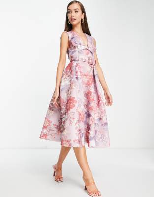 Midi dress by ASOS DESIGN The only plus-one you need Floral design Plunge, twist front Sleeveless style Belted waist Open back Regular fit