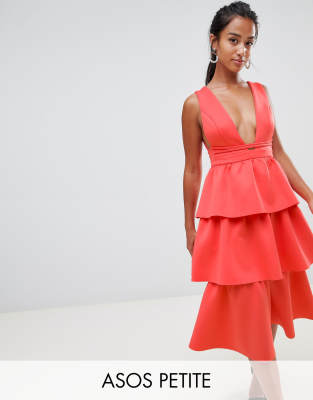 Petite dress by ASOS DESIGN Take that dress code up a level Plunge neck Tiered design Layers on layers Low back Midi length Regular cut Fits you just right