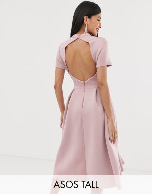Tall dress by ASOS DESIGN If you have to dress up, dress up in this High neck with button fastening Short sleeves Pleated skirt Open back Zip-back fastening Midi length Regular fit Just select your usual size