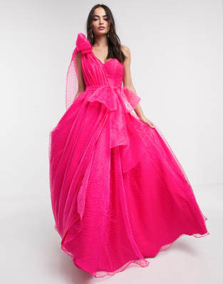 full prom one shoulder maxi dress with detachable waist bow detail in fuchsia