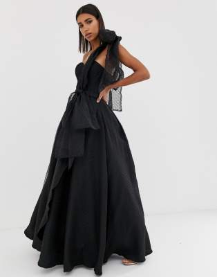 full prom one shoulder organza maxi dress with detachable bow detail in black