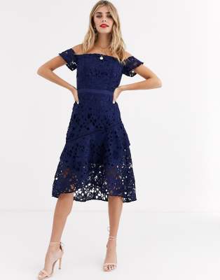 Midi dress by Chi Chi London Add-to-bag potential: considerable Square neck Off-the shoulder design Contrast waist panel Flippy hem Zip-back fastening Regular fit Just select your usual size