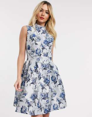 Dress by Chi Chi London No occasion necessary Silky-feel lining to top Floral print High neck Sleeveless style Button-fastening to neck Open back Zip-back fastening Regular fit True to size