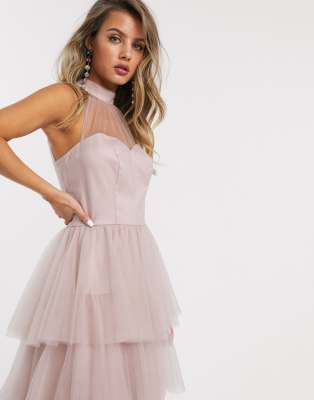Midi dress by Chi Chi London May induce confidence Halter neck Mesh panel Tiered skirt Tie-keyhole back Zip-back fastening Regular fit True to size