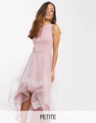 Petite dress by Chi Chi London Red carpet not included Round neck Sleeveless style Contrast skirt Dipped hem Button-keyhole back Zip-back fastening Regular fit True to size