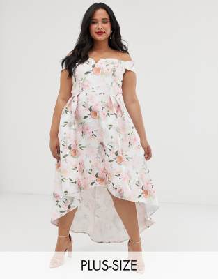 Plus-size dress by Chi Chi London For that thing you RSVPd to Floral print Bardot neck Dip hem Zip-back fastening Regular fit Just select your usual size