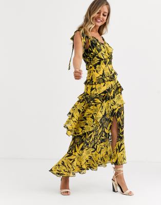 one shoulder midaxi dress in yellow black mixed print