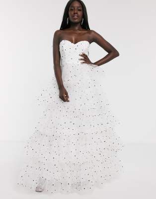 Maxi dress by Dolly & Delicious Red carpet not included Polka-dot embroidery Sweetheart neck Inner gripper tape for a secure fit Bonded cups Tiered layers Net underskirt Zip-back fastening with hook and eye Regular fit True to size