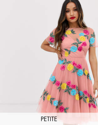 Petite dress by Dolly & Delicious For that thing you have to go to Cami lining Boat neck Floral applique Button-keyhole back Zip fastening Regular fit Just select your usual size