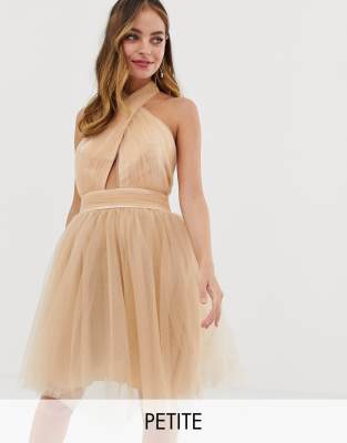 Petite dress by Dolly & Delicious For that thing you have to go to Smooth lining Plunge neck Satin-style ribbon tie Glitter finish Zip-back fastening with hook and eye Regular fit A standard cut for a classic shape