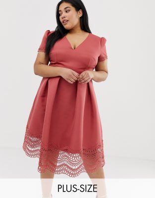 Plus-size dress by Little Mistress Hey, fancy pants Plunge neck Lace trims Zip-back fastening Midi length Regular fit A standard cut for a classic shape
