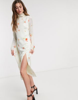 Dress by Lost Ink. Crack the dress code High neck Floral print Button detail Thigh-high split Regular fit True to size
