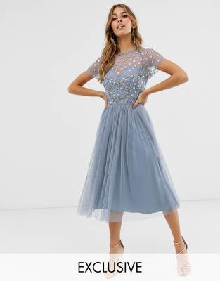 Midi dress by Maya If in doubt, go all out Partially lined Crew neck Bead and sequin embellishment Zip-back fastening Regular fit Just select your usual size Exclusive to ASOS
