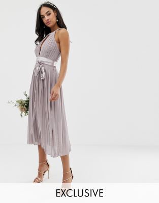 pleated midi bridesmaid dress with cross back and bow detail in grey